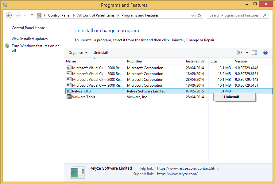 Right click on Relyze Desktop in the list of programs installed on your computer and select to Uninstall, as shown in the screenshot below.