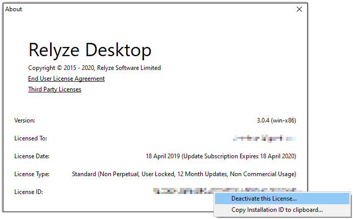 To deactivate a license via the GUI, open the About dialog and right click on the License ID. A pop-up menu will appear allowing you to deactivate the license.