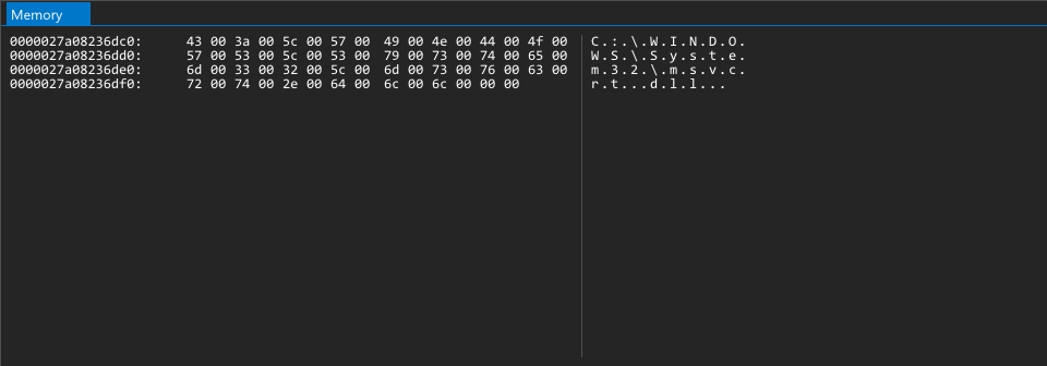 The address of the allocated chunk is displayed in the left hand side column, the raw bytes in hex format are displayed in the center and the ASCII characters corresponding to these bytes (where applicable) are displayed to the right.