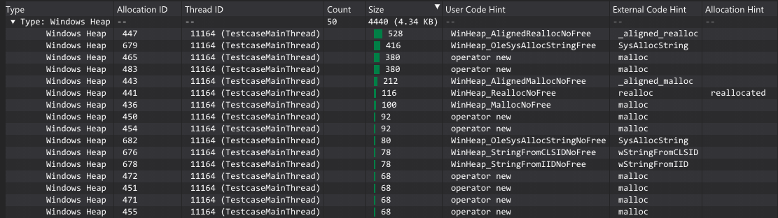 - User Code Hint - The symbol name of the first non external symbol in the call stack for this allocation.