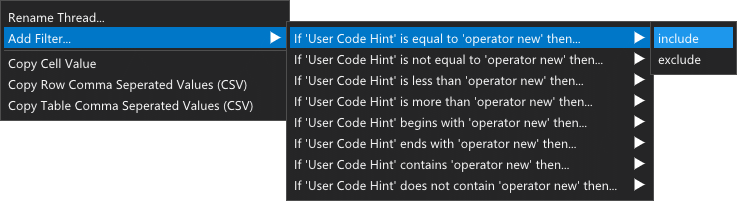 - Copy Table comma Separated Values (CVS) - Copies the entire call stack table in a comma separated value (CSV) format to the system clipboard.