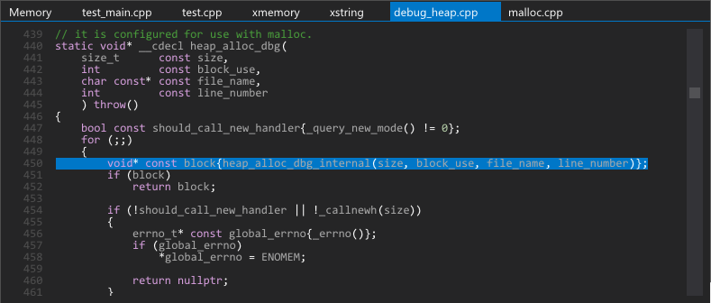 When you select an allocation in a Snapshot, the call stack for the allocation will be displayed in the Call Stack window. If symbols are available a source file location and line number will be associated with each entry in the call stack. If you click on an entry in the call stack which has a symbol file associated with it, this file will be displayed and the line number for the call stack entry will be scrolled to and highlighted.
