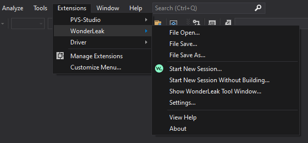 You can access the WonderLeak extension via the Extensions menu in the Visual Studio main menu bar.