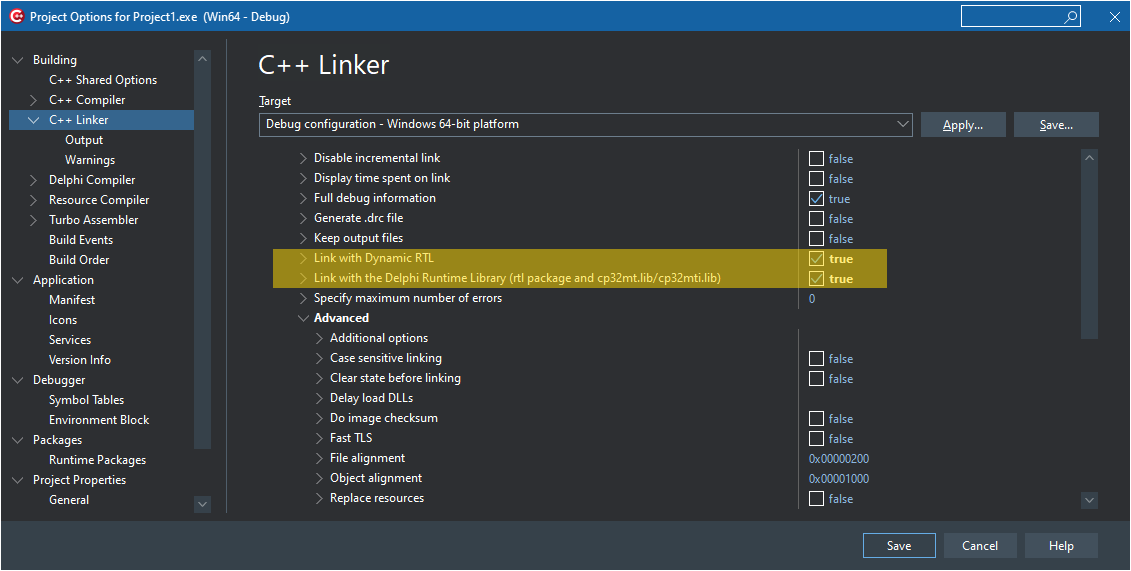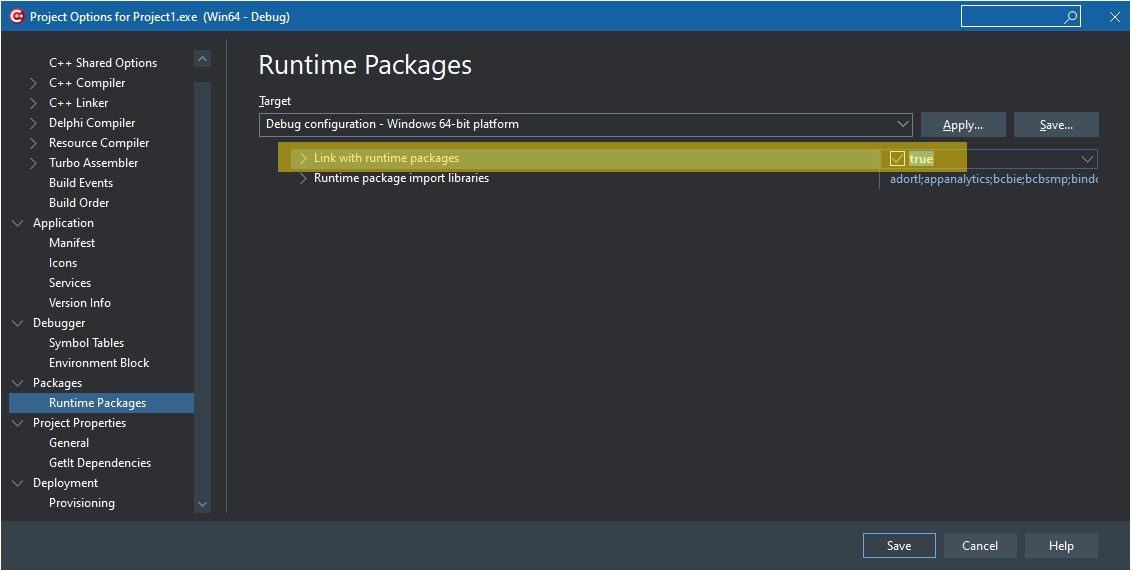 For either Win32 or Win64 projects, after opening a project within the IDE, enable the Debug configuration. First you must ensure the debug configuration is set to link with the Dynamic RTL and the Delphi Runtime Library.