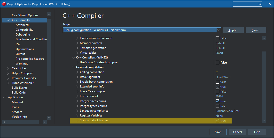 To configure a project built by Embarcadero's C++ Builder, the following settings should be applied to achieve the best results.