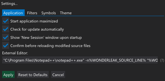 External Editor - An external editor may be used to open source files that are displayed by WonderLeak. You may specify the path to your preferred external editor along with the command line to use to allow the external editor open the desired file and line number. You may use the tag